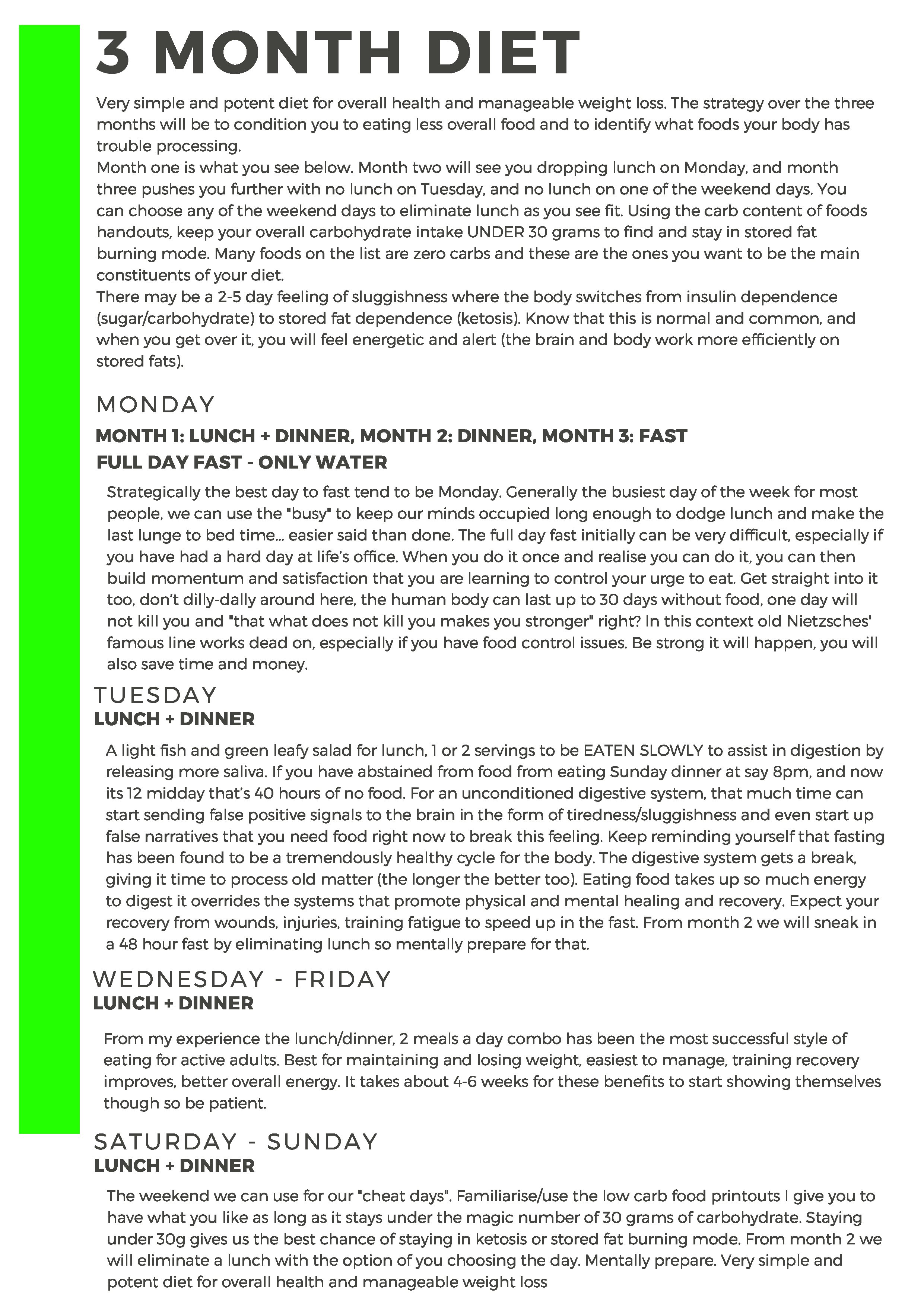 This is a difficult plan to follow but it works. Email me info@ricogroupfitness.net if you need assistance with this diet plan. The goal of this plan is to get through the 3 months and take ongoing dietary habits from that point, which will act as a reset point for your digestive system. Please note that if you are considering trying this plan it requires a serious effort which is why it works, so be prepared mentally before the attempt.